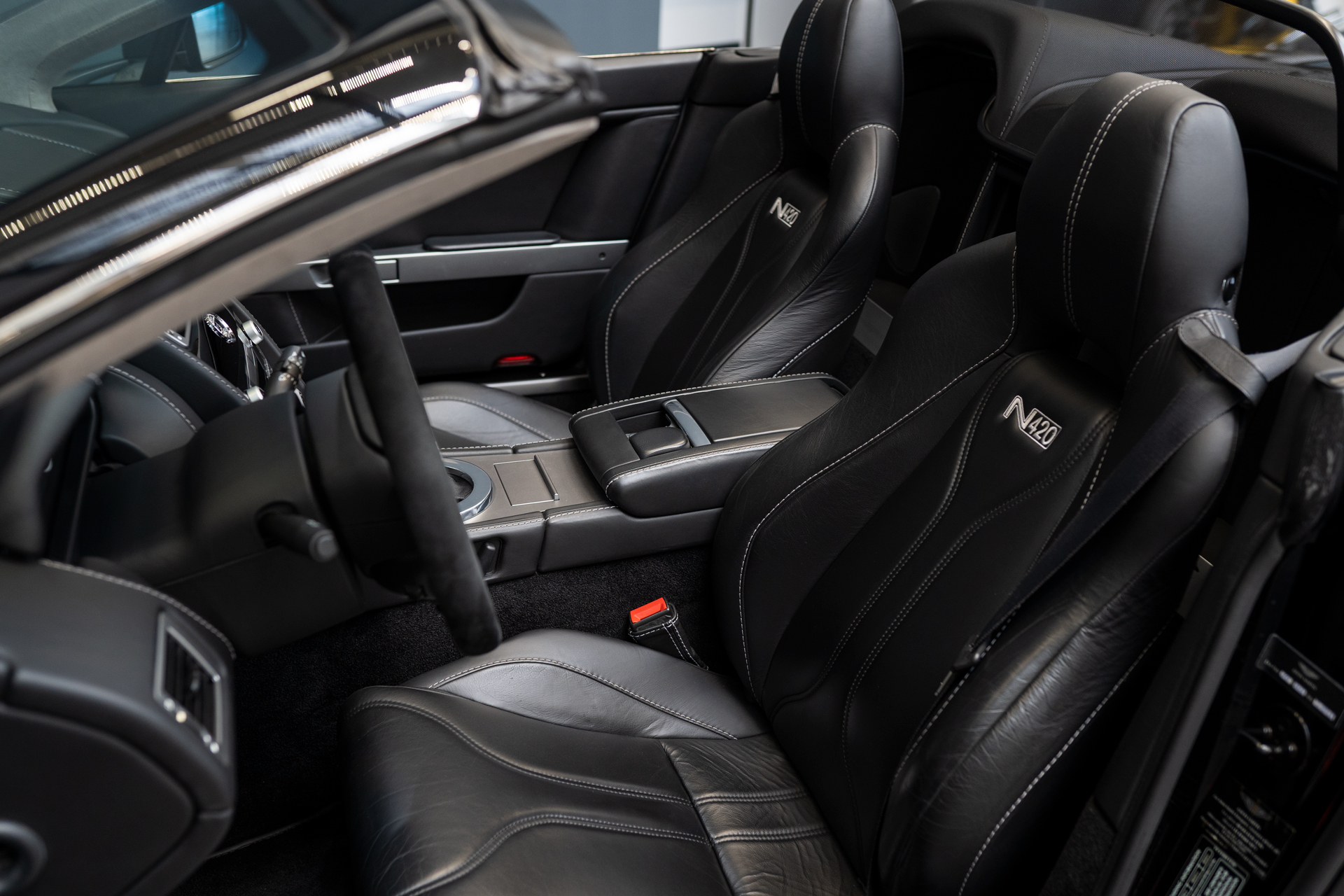 Der Aston Martin V8 Vantage N420. Wobei N für Nürburgring steht. Das Sondermodell verfügt im Gegensatz zum normalen Vantage über sportliche Ausstattungsmerkmale wie ein Bilstein-Sportfahrwerk, eine Sportabgasanlage, diverse Carbonaplikationen, ein niedrigeres Gesamtgewicht und die zwei charakteristischen Hutzen hinter den Sitzen. Unsere #021 von 420 verfügt zudem über das sehr seltene Handschaltgetriebe (unseres Wissens der einzige auf dem Markt momentan). Das Fahrzeug ist durchgegend scheckheftgepflegt bei Aston Martin und hat vor wenigen Kilometern einen kompletten Service erhalten. Der Wagen hat zwei Vorbesitzer, welche sich aber persönlich kannten und den Wagen immer geschont haben.
