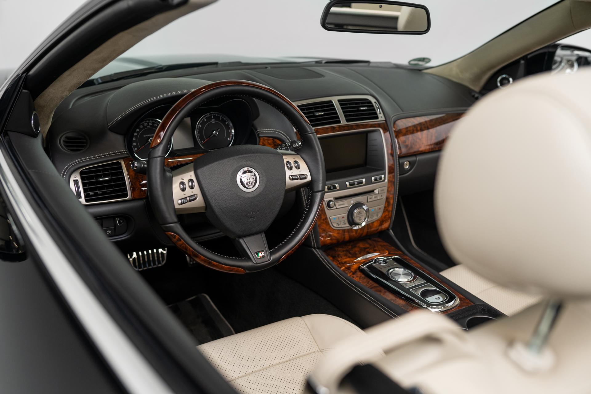 Jaguar XKR. Gediegen cruisen oder sich mit brachialem Sound in die edlen Ledersitze drücken lassen – der Jaguar XKR kann beides. Der 5l Kompressor V8 liefert 510 PS und 625 Nm, exklusiv an die Hinterräder. Unser Modell wurde 2009 zugelassen, kommt aus zweiter Hand und hat grade einmal 46.717km gelaufen. Der Jag begeistert mit seiner klassischen Farbkombi, außen schwarz und innen Champagner, frisch aufbereitet für den zukünftigen Besitzer. Der perfekte Reisebegleiter für Alltag, Spaß und Urlaub.