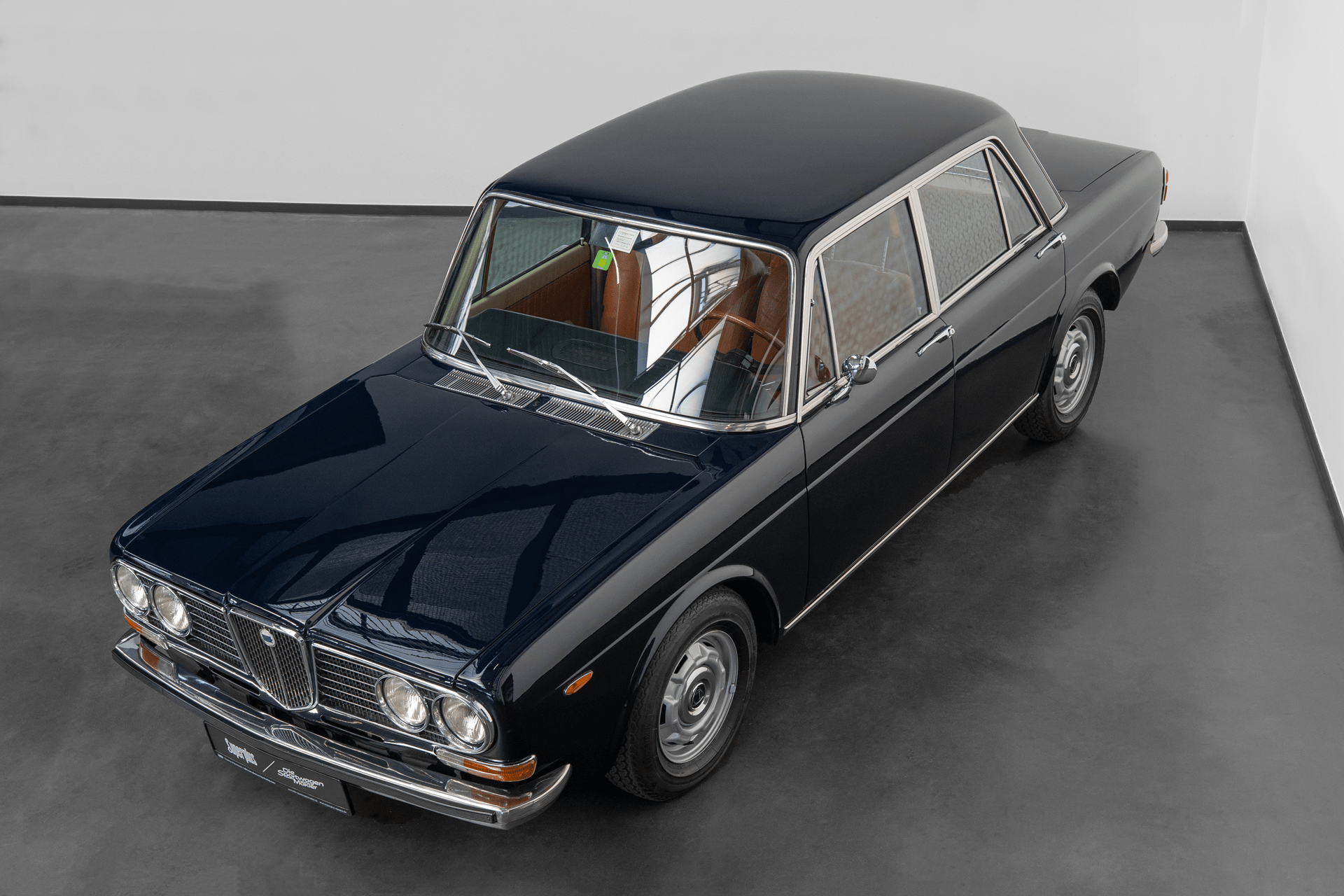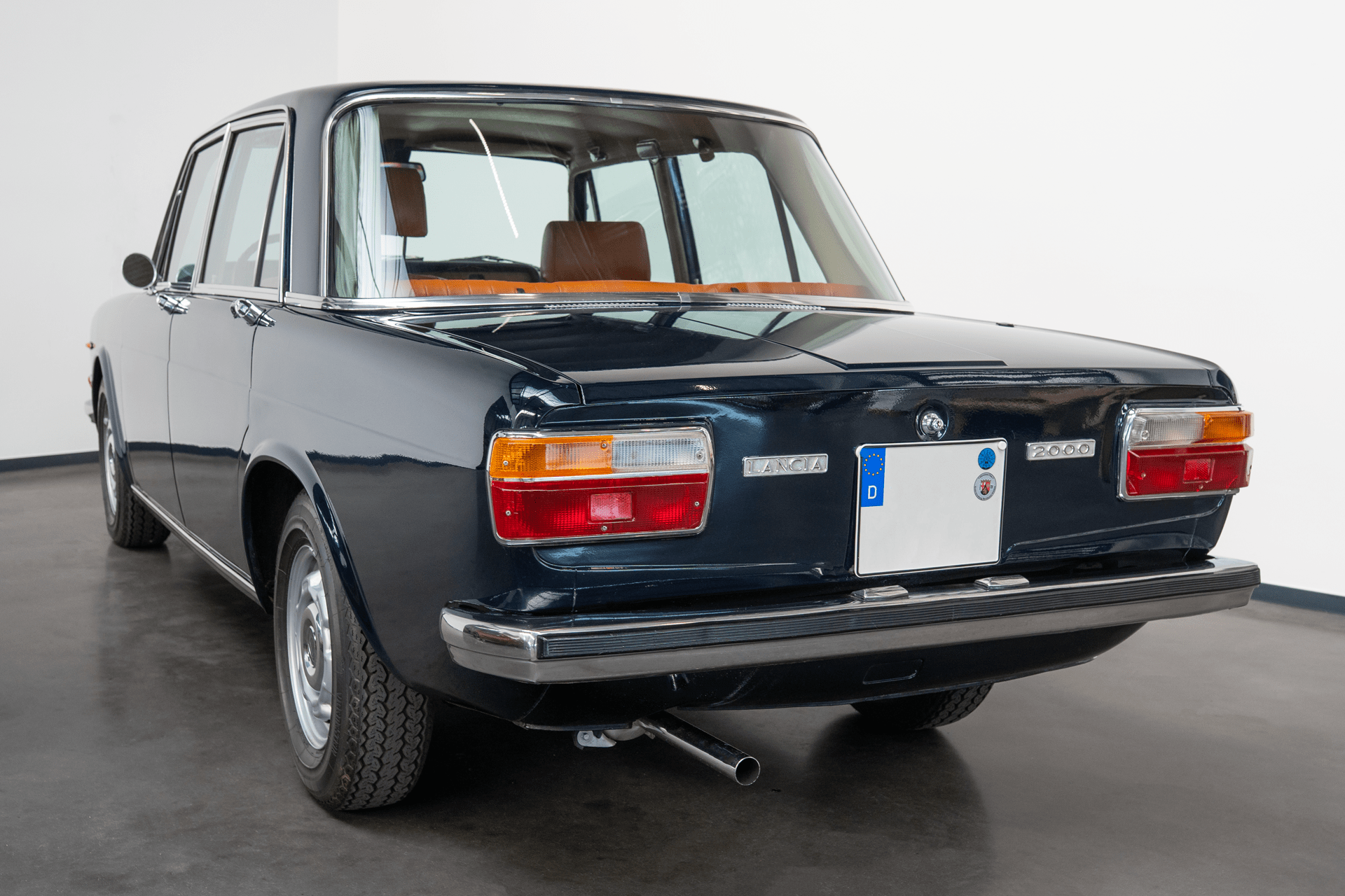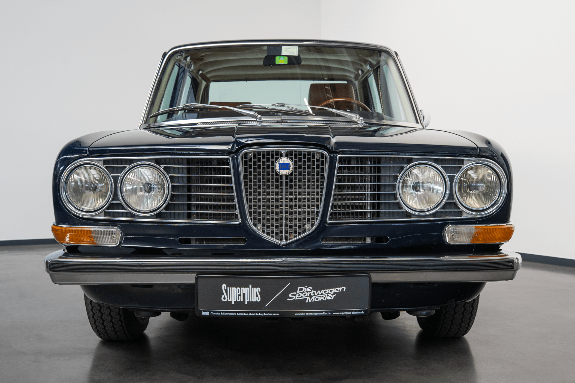 Die Außenfarbe „Bleu Lancia“ unterstreicht den distinguierten Auftritt dieser Limousine – ein tiefes, edles Blau, das perfekt mit dem braunen Lederinterieur harmoniert und die zurückhaltende Eleganz des Fahrzeugs stilvoll betont.